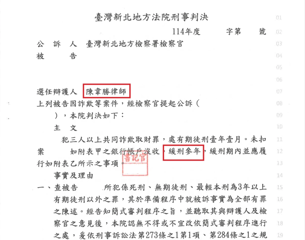 陳韋勝律師與張凱琳律師是專辦詐欺律師,具許多刑事辯護經驗,有處理刑事案件專長,專辦詐欺案件,如人頭帳戶、警示帳戶、洗錢詐欺、車手、虛擬貨幣洗錢、組織犯罪、加重詐欺等,也有不起訴、無罪、緩刑等成功案例,